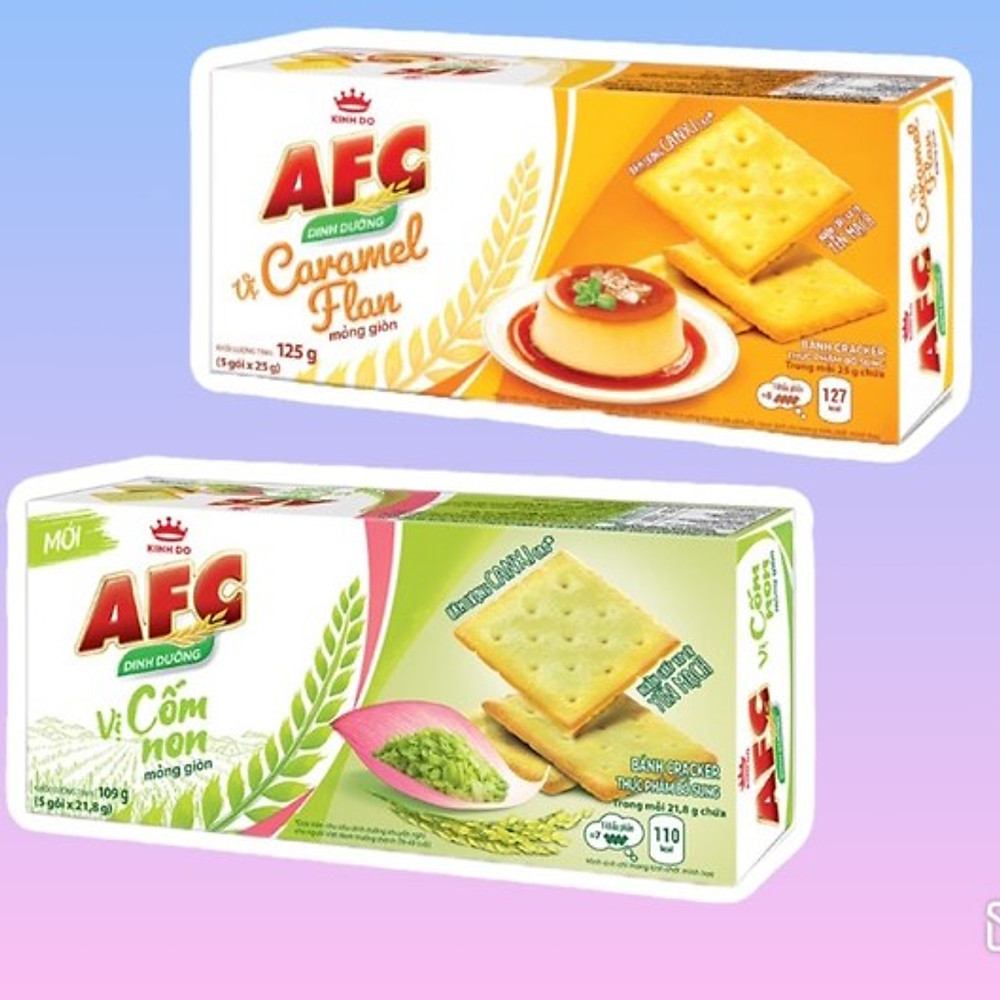 – Bánh AFC vị rau được làm từ những nguyên liệu tự nhiên như: bột mì, dầu cọ, mạch nha, bột hành, hành lá khô…