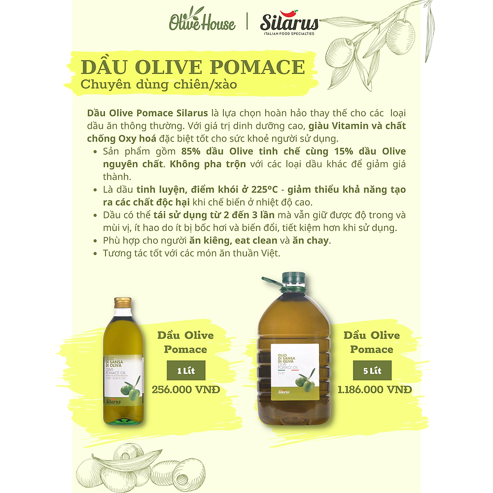 Dầu Olive Pomace được sản xuất bằng cách ép nóng, chịu được nhiệt độ cao (225oC) nên rất thích hợp để chế biến các món chiên, xào mà vẫn không làm dầu bị biến đổi. Dầu có thể dùng lại 2-3 lần do đặc tính chịu nhiệt, ít bốc hơi nên đỡ hao, vẫn giữ được độ sánh và trong. Dầu Olive Pomace Silarus được sản xuất và đóng gói trực tiếp tại Ý.
