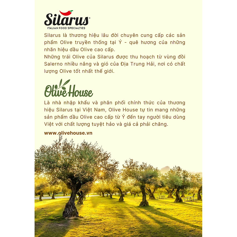 Dầu Olive Pomace Silarus 1L là loại dầu ăn thay thế hoàn hảo cho các dầu ăn thông thường dùng trong nấu ăn hằng ngày. Sản phẩm gồm 85% dầu Olive Pomace trộn chung với 15% dầu oliu nguyên chất, không hề trộn thêm các loại khác (như dầu hướng dương, dầu nành…) như các loại dầu Pomace trên thị trường hiện nay.