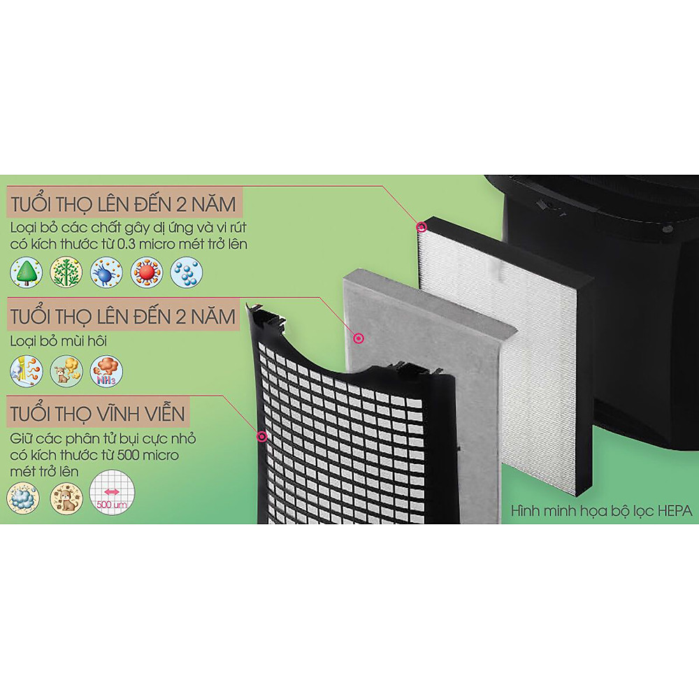 Bộ lọc Hepa, lọc Carbon cao cấp có độ bền tới 02 năm sử dụng, đặc biệt model Than carbon của máy G50E-W khá dầy dặn so với model trước đó.
