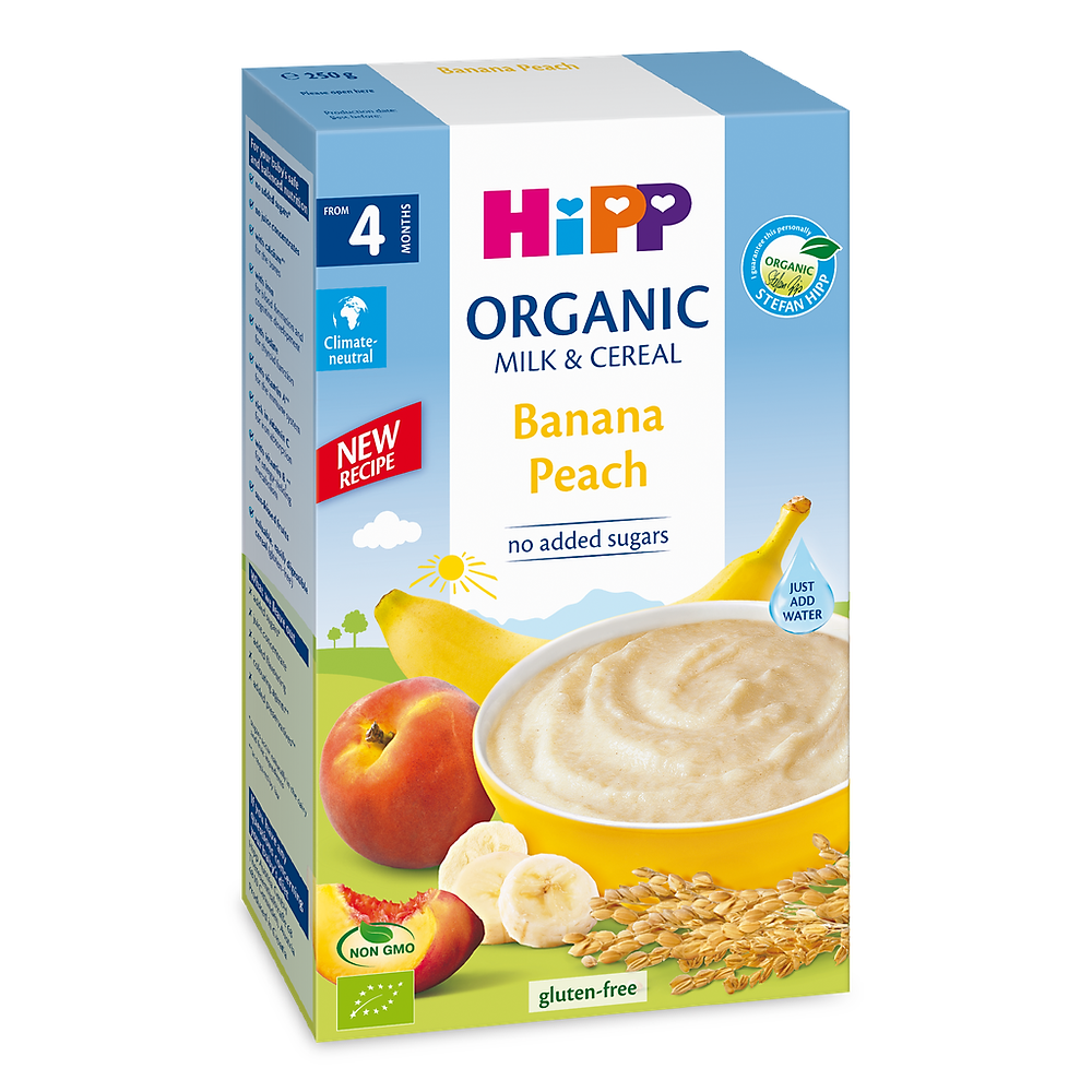 Bột sữa DD hoa quả HiPP Organic – Chuối, đào 250g cho bé từ 6 tháng tuổi